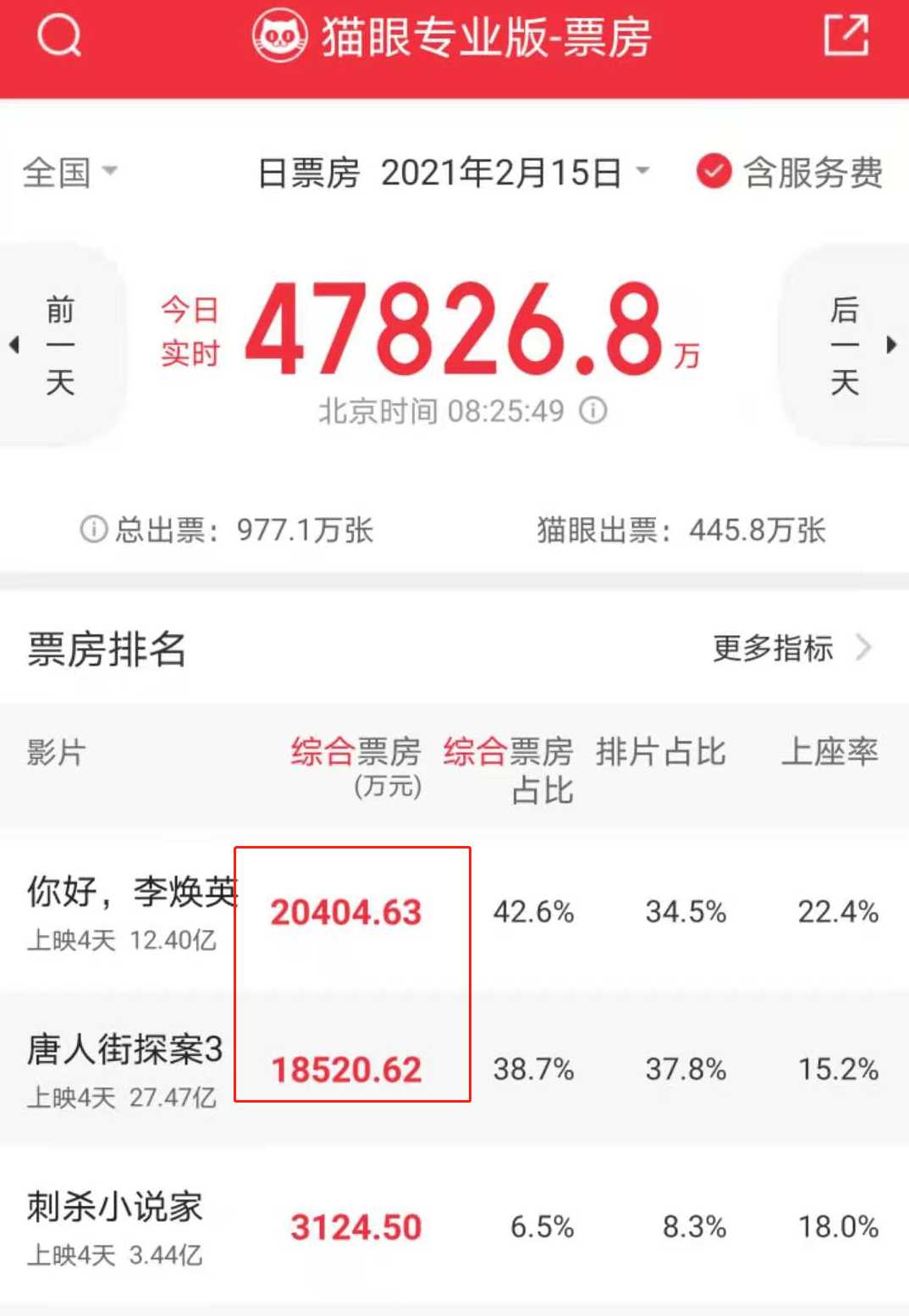 而在口碑爆棚的基础上,《李焕英》的票房表现也是后劲十足,根据猫眼实时数据显示,今日《你好,李焕英》排片已上升至34.5%,与《唐探3》的37.8%已相差不多,而在排片落后的背景下,当日综合票房已经反超《唐探3》: