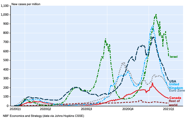 2月15日,加拿大报告的新增病例为每百万人74例而,英国新增185例,美国新增257例。