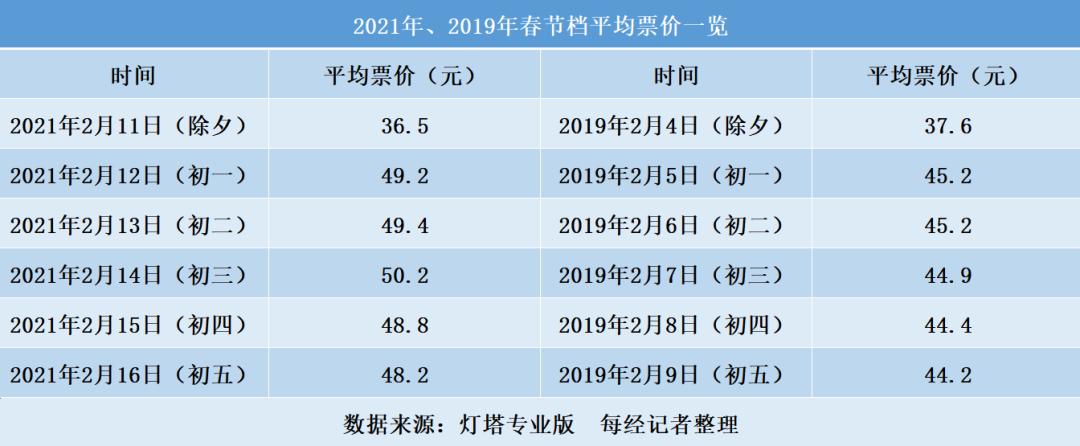 图片来源:票务平台截图数据显示,今年春节档平均票价在36.5元~50.2元之间浮动,最高平均票价出现在情人节当天。大年初一当天的平均票价为49.2元,较2019年春节同期的45.2元上涨了8.8%。