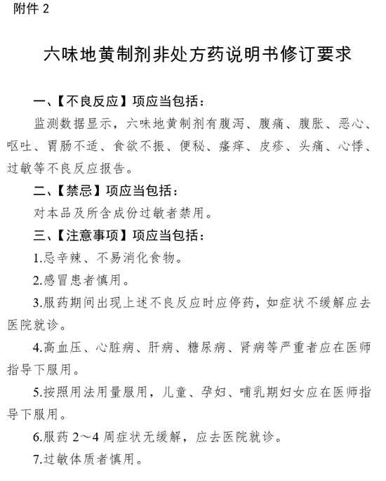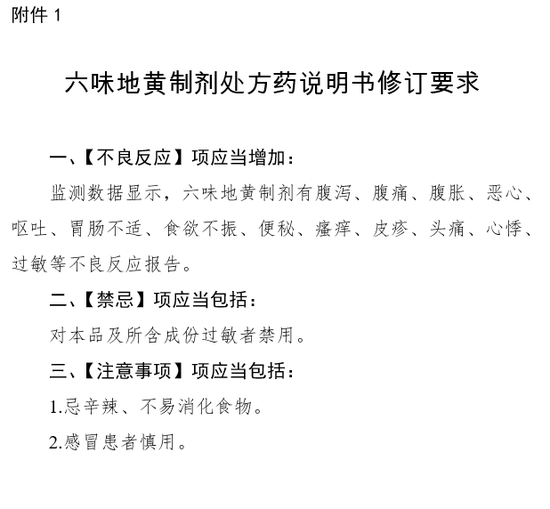 根据药品不良反应评估结果,为进一步保障公众用药安全,国家药品监督管理局决定对六味地黄制剂(包括丸剂、胶囊剂、片剂、合剂、煎膏剂、颗粒剂)说明书【不良反应】【禁忌】和【注意事项】项进行统一修订。现将有关事项公告如下: