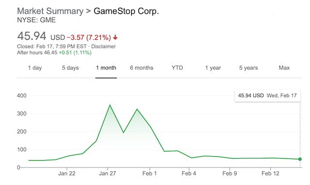 自1月28日GameStop股价最高达到483美元以来,GameStop已经损失了超过200亿美元的市值。目前,该股票的价格仅为每股不到46美元。
