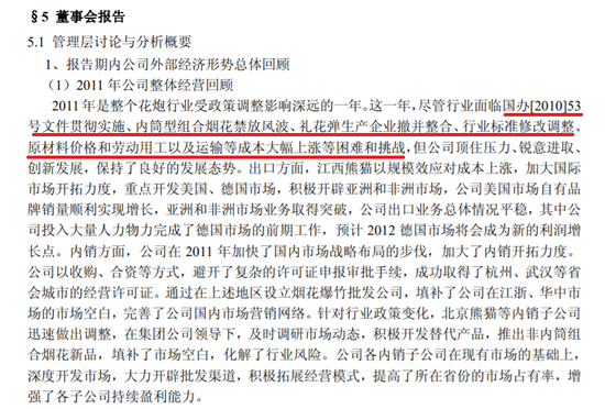 在2010年财报中,熊猫烟花对当年经营情况进行回顾时下的结论还是“稳步增长”,董事会报告的总体基调积极乐观。