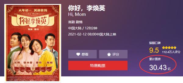 上映6天,《你好,李焕英》累计票房破30亿,逼近《唐探3》(图截自猫眼电影)
