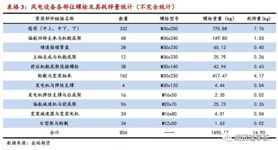 关于风电设备各部分螺栓,需要说明的是由于风机大小不同,所消耗的螺栓型号及数量也不相同。本文在此,以2MV某一特定品牌安装机型为例,通过拆分其采购安装包,我们发现该机型对于各类别螺栓的需求量如上表。
