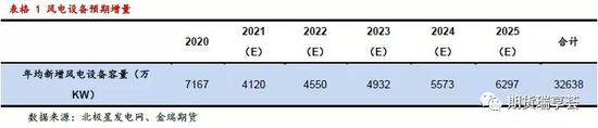 由于国家今年新出台的政策中规定2021年底未完成核准备案及并网的风电项目将不再纳入补贴,2020年风电行业出现了“抢装潮”,新增风电装机数量激增,基于这一特殊原因,预计2021年新增设备装机数会有较为明显的下滑,同比下降约42.51%,之后的年份预计新增风电设备容量将逐渐增加。基于这个前提,我们对“十四五”期间每年新增风电设备容量的测算如下: