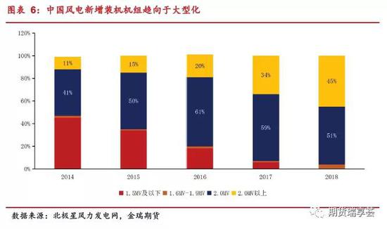 由于市场上风电设备机型的单位功率并不统一,2018年之前,1.5MV功率的机型是陆上风电设备市场的主流机型,其累计市场占比接近一半,而从2018年起,2MV功率的风力发电机开始兴起,其新增装机量占据了我国新增风电设备市场的大半江山,目前我国新增装机的风电机组平均功率为2.2MV,预计未来新增机型中功率在2MV以上的机型将占据主流,为方便计算和统计,本文将采用2MV的机型为基准来计算风电设备的增量。