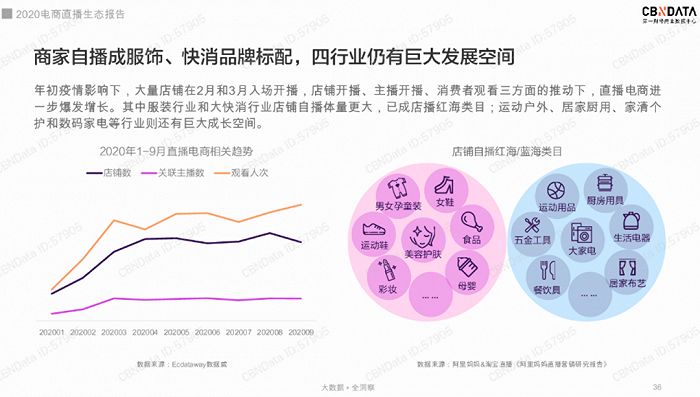《2020电商直播生态报告》显示,服装行业和大快消行业店铺自播体量更大,已成店铺自播的红海类目,运动户外、居家厨用、家清个护和数码家电行业还有巨大的成长空间。