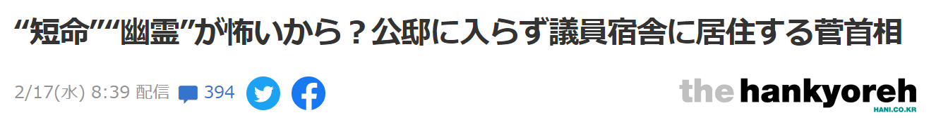 《韩民族日报》:害怕“幽灵鬼魂”、“政治寿命缩短”?菅义伟不搬入公邸而是居住在议员宿舍