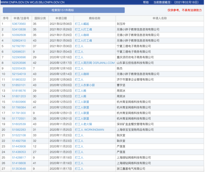 而在中国商标网,类似于“打工人”等热词已被申请注册为商标。澎湃新闻搜索发现,截至2月18日,包含“打工人”的申请或已注册商标有151件,商标名称包括“打工人打工魂”“打工人奶茶”“打工人崛起”“打工人的星期八”等。