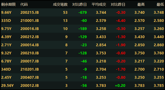 剩余期限9.66Y 20国开15 最高成交在3.7475%,最低成交在3.74%,实时行情3.74%,较昨收下行0.25BP。今日成交53笔(昨日成交732笔)。