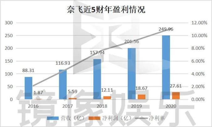 2020年全年,奈飞营收为249.96亿美元,与上年的201.56亿美元相比增长24%,净利润同比增长47.9%至27.61亿美元,摊薄后每股盈利6.08美元,上年同期为4.13美元。奈飞每财季的营收和净利润都保持稳定增长,2016-2020财年的净利率分别为2.11%、4.78%、7.67%、9.26%、11.05%,意味着奈飞的经营效率在持续增强。