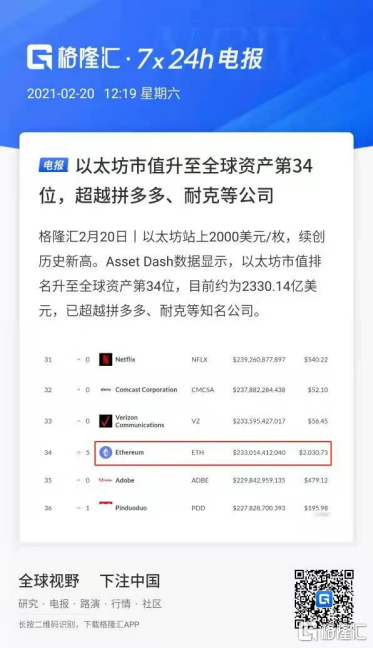 同时,市值第二大的加密数字货币以太坊也首次突破了2000美元/枚,总市值2300亿美元,在全球加密货币中的市值占比13%。