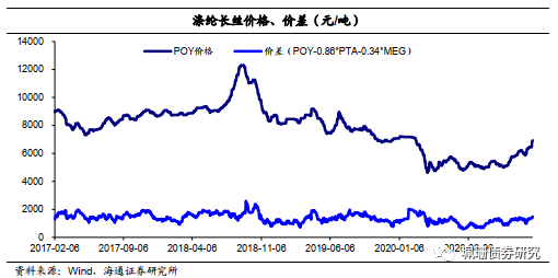 涤纶价差仍处高位,下游织机开工率下降明显。从价差来看,截至2月19日,POY-0.86*PTA-0.34*MEG价差为1487.1元/吨,较去年末上涨170元/吨。由于春节影响,涤纶下游织机开工率下降明显,以19年情况来看,其开工率水平基本从除夕前20天左右开始明显下降,直到元宵之后开始基本恢复到正常水平。
