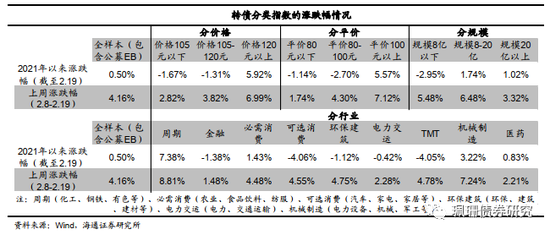 上周(2.8-2.19的5个交易日,下同)中证转债指数上涨4.58%,周日均成交量(包含EB)281.86亿元,环比下降21.66%,我们计算的转债全样本指数(包含公募EB)上涨4.16%。同期沪深300指数上涨5.39%、创业板指上涨2.88%、上证50上涨4.52%,国证2000上涨8.38%。
