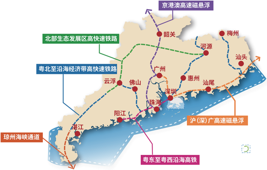 根据规划,交通基础设施方面,提出将预留6大重要交通廊道,包括京港澳高速磁悬浮、沪(深)广高速磁悬浮、北部生态发展区快速铁路、粤北至沿海经济带快速铁路、琼州海峡通道、粤东至粤西沿海高铁。