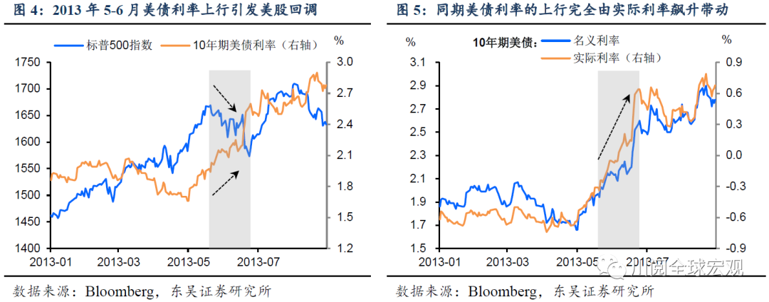 那么,什么样的美债利率上行会导致美股回调呢?通过梳理金融危机后的历史,我们发现仅有两个时期,这两个时期美债利率在上行的同时出现了美股的回调,分别出现在2013年的年中和2018年的年初: