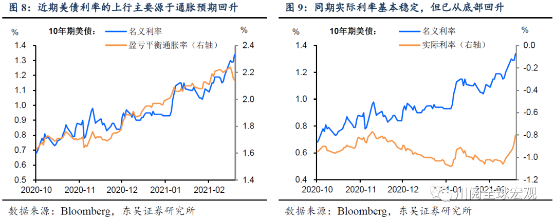 与上述两次历史时期不同,此轮美债利率的上行在多数时间内主要由通胀预期回升的带动(图8),尤其是在2月16日破1.3%之前,其年初以来的上行幅度有70%是通胀预期回升贡献,美股也持续创新高。然而,在10年期美债利率破1.3%之后,通胀预期转而下行,实际利率的加速回升带动美债利率进一步上行(图9)。