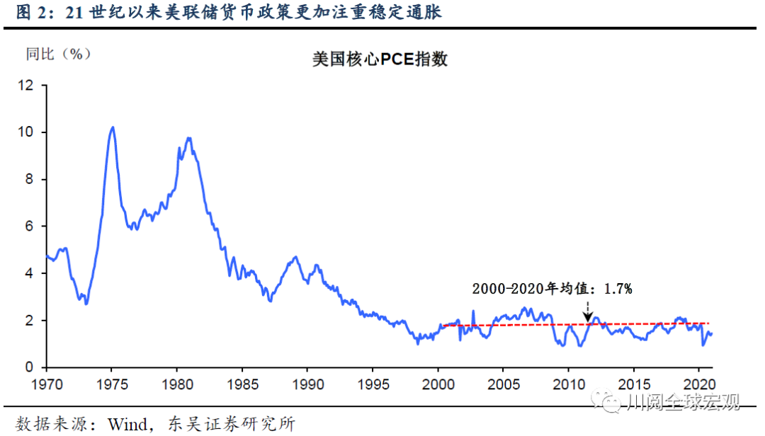 为什么美股和美债利率的相关性会在21世纪初发生结构性的变化?答案在于通胀,如图2所示,21世纪以来由于美联储在货币政策上更加注重稳定通胀,美国经济过热的风险明显降低,因此美债利率的上行往往反映的是经济增长前景的改善和通胀的温和回升,这一宏观环境同样利好股票上涨。