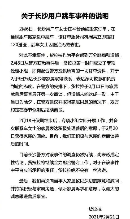 2月6日,长沙用户车女士在货拉拉平台预约搬家订单,在当晚跟车搬家途中跳车,该订单服务司机周某立即拨打120送医,后车女士因医治无效去世。