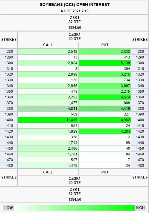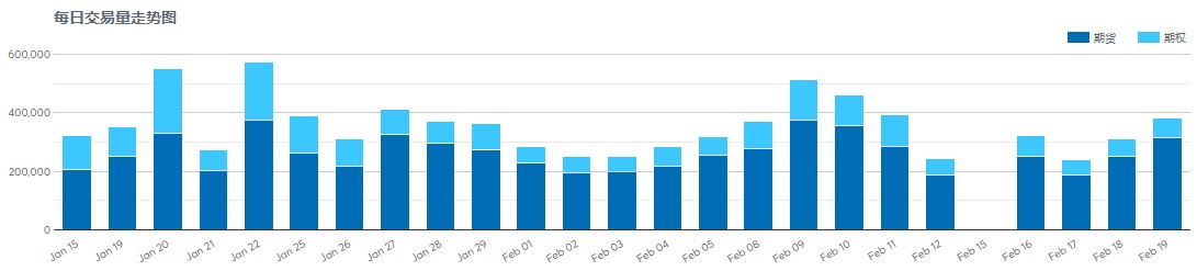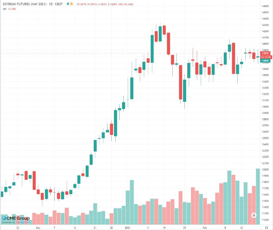由于利多在前期已有所消化,因此供需报告发布之后,市场反而出现回调。此后一周没有太多波澜,美东时间2月19日(上周五),芝商所大豆期货主力5月合约(ZSK1)窄幅震荡,收于1380美分/蒲式耳,环比微涨0.29%。当日大豆期货总成交31.5万手,环比增加26%。大豆期权总成交22.2万手,环比增加11%,市场交投逐渐有所回升。
