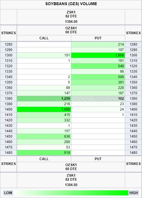 如果继续看多美豆,可以布局买入期货的同时卖出上方看涨期权,例如做多1手ZSK1同时卖出2手行权价1400的虚值看涨期权。后市如果美豆上涨,组合获利,如果大涨突破,可以平掉卖权,期货多仓继续盈利。这个组合中的卖权收到的权利金也一定程度上抵御了下跌风险。