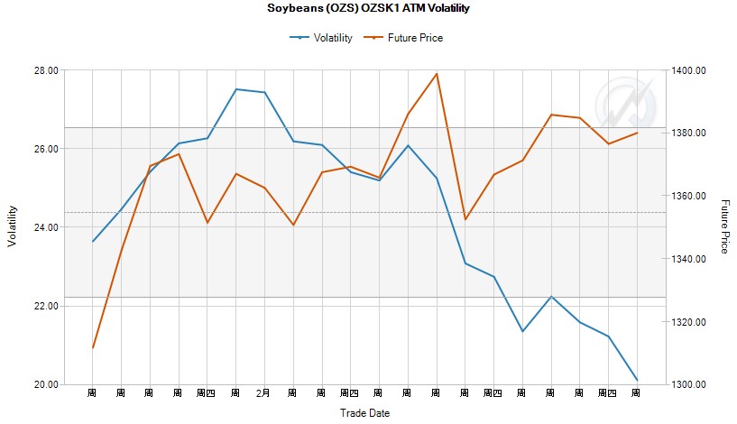 在第一部分中可以看到美豆期货ZSK1价格2月初以来在1300~1400区间内变化,那么如果在上方卖出较大压力位的看涨期权,同时在下方卖出较强支撑位的看跌期权,只要期货价格在区间变动,无论涨跌,那么每天都可以收到时间价值,同时隐含波动率不断减小,这部分也可获利。也就是说期货方向上不好交易的时候,从时间和波动率维度赚取利润,这就是期权多维交易的优势。例如卖出行权价分别为1400和1340的看涨期权和看跌期权,至今都没有突破区间范围。当然前期卖宽跨头寸到现在可以继续持有或者考虑止盈,目前隐波水平较低,已不是入场的最佳时机。