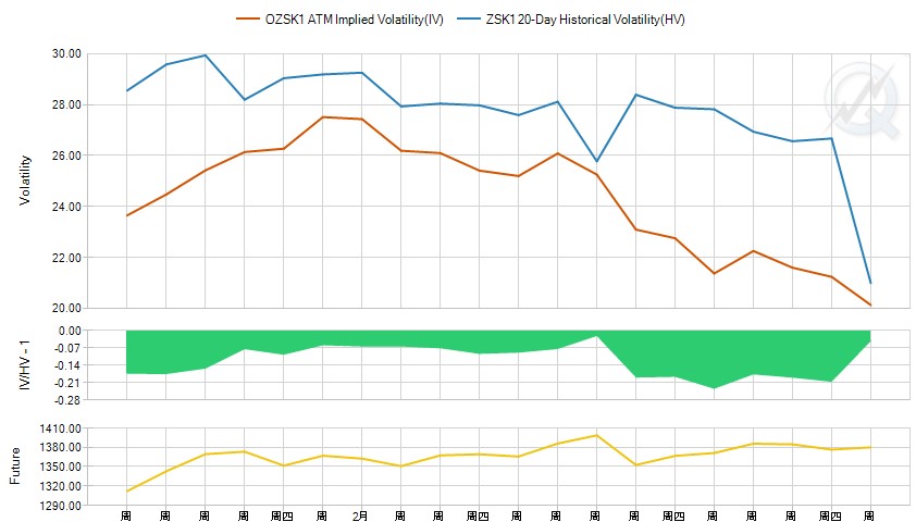 从成交持仓分布情况来看,ZSK1期权合约的看涨期权和看跌期权最大成交量行权价分别为1400和1300,各成交1668和1056手;看涨期权和看跌期权最大持仓量行权价也分别为1400和1300,各持仓11419手和5138手,市场整体认为1400处压力较大,1300有所支撑。