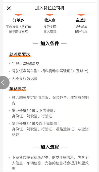 而实际上,入驻和审核相对容易得多。“你有一个车,有身份证、驾驶证,然后到平台注册一下就行,不需要营运证。货拉拉根本不会对你个人审核什么资质的。”货拉拉司机朱师傅告诉深燃。这一说法得到多名司机的认同。