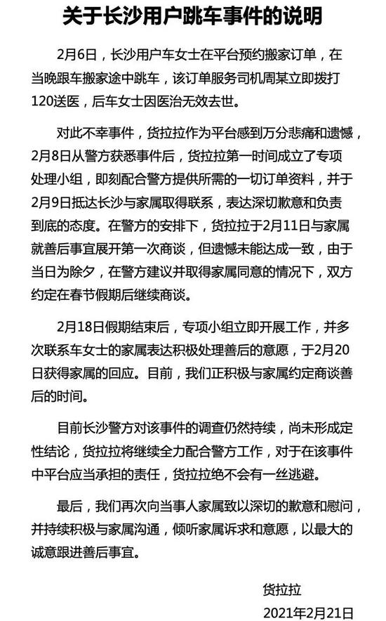 货拉拉总部最终在2月21晚通过微博回应称:目前长沙警方对该事件的调查仍在持续,尚未形成定论,货拉拉将继续全力配合警方工作。