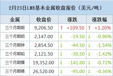 伦敦时间2月23日17:00(北京时间2月24日01:00),LME三个月期铜收涨1.2%,报每吨9,206.50美元,盘中触及每吨9,305美元,为2011年8月以来最高。