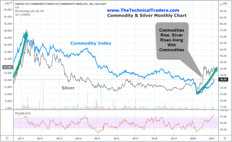 最后Chris Vermeulen强调了大宗商品与银价之间的相关性。一般来说,当大宗商品价格上涨时,白银也会上涨。下面的大宗商品和白银月线表突出了2010~2011年大宗商品的涨势,以及同期白银的惊人涨势。