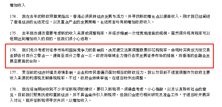 2月24日,香港特区政府财政司司长陈茂波发表的新一份财政预算案宣布,为增加特区政府收入,计划上调股票印花税税率,由现时买卖双方按交易金额各付0.1%,提高至0.13%。政府将继续全力推行各项发展证券市场的措施,将香港的金融业发展至更高的台阶。