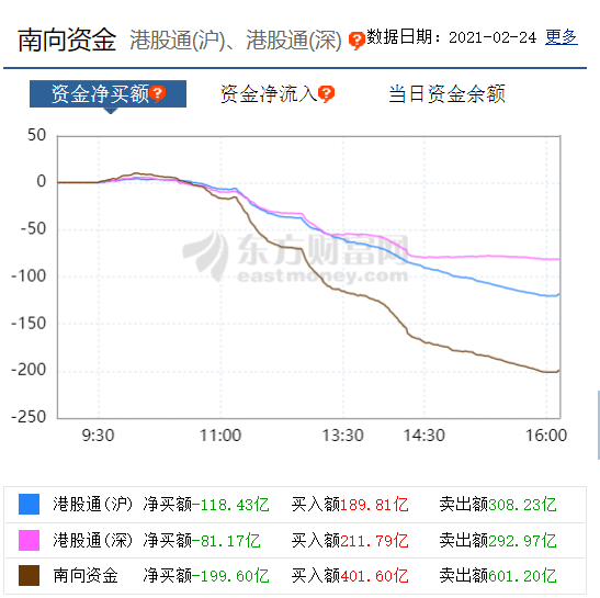 南向资金合计净卖出199.6亿港元,其中港股通(沪)净卖出118.43亿港元,港股通(深)净卖出81.17亿港元。