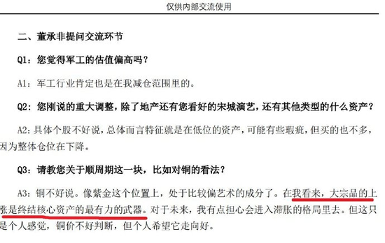 他表示,军工行业处于个人减仓范围中。而对于顺周期,他认为大宗商品的上涨是终结核心资产的最有力的武器。