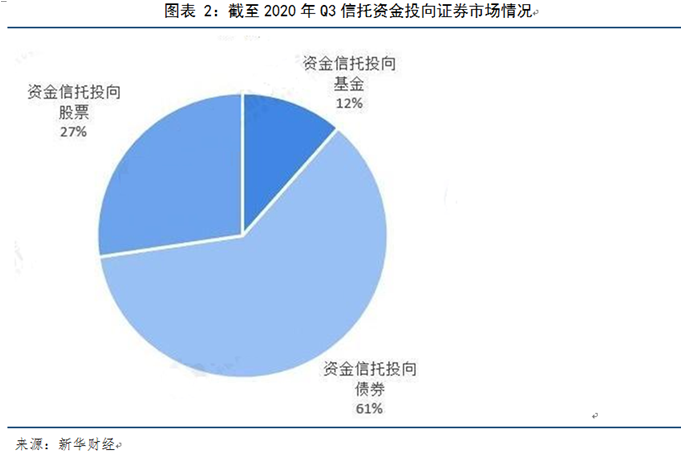 证券业务信托方面,随着资管新规的发布,传统信托业务受限,证券业务将逐渐受到信托公司的重视与探索,信托公司主动管理和投研能力加强,证券投资信托的发行量趋于上升。新增信托项目中,投向证券市场增幅最大,2020年上半年达到196.1%。3季度末,资金信托投向证券市场结构中,投向债券市场规模最大,达到13543.68亿元,占比达61%,超过一半以上比重。