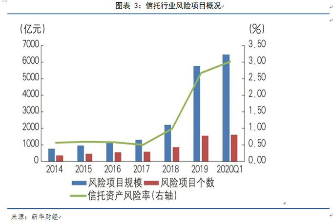 行业风险项目逐渐暴露,风险项目个数持续增长,风险资产规模呈上升趋势。2019年,信托行业风险资产规模与风险项目数量大幅上升。截至2020年第一季度末,信托行业风险资产规模6431亿元,较年初增加661亿元;风险项目数量1626个,较年初增加79个;资产风险率3.02%,较年初增长0.34%。在今后一段时期内,存量风险化解已成为信托行业一项重要的任务。