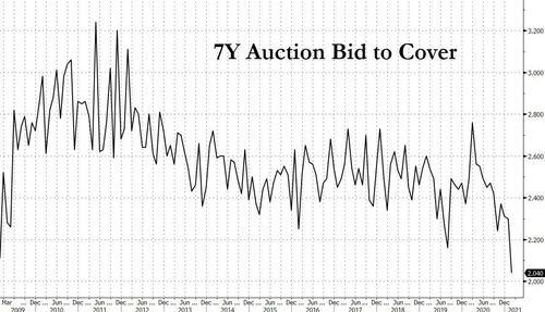 素来以毒舌著称的金融博客Zerohedge称,这说明突然之间没有外国人想要触碰美国国债了,这绝对堪称多年来7年期美债拍卖的最尴尬和最具灾难性的时刻。更可怕的是,它出现在一个不该出现的时点,当前美债收益率恰恰因为市场的通胀恐慌而止不住地飙升。