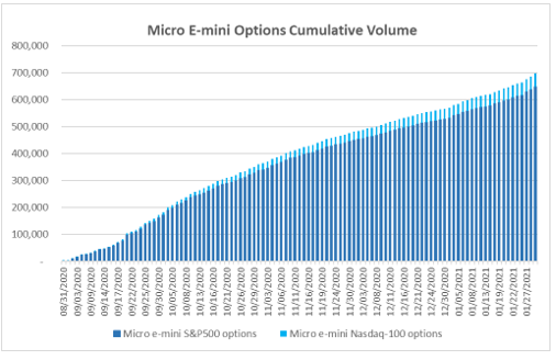 据悉,芝商所在微型E-迷你期货的强劲流动性基础上,去年推出基于标普500和纳斯达克100微型E-迷你期货的期权产品,以增加期权的灵活性,让市场参与者能够更加精准地使用较小的名义合约来管理股票指数敞口。截至今年1月底,微型E-迷你期权累计交易近70万张合约(图3),可见投资者对这产品的兴趣不断增加。