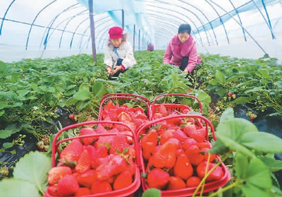 近年来,河南省信阳市光山县大力发展草莓种植,帮助村民实现家门口就业,让更多贫困群众通过种植草莓走上致富路。图为日前村民在光山县紫水街道办事处三里桥村信豫草莓种植基地大棚里采摘草莓。
