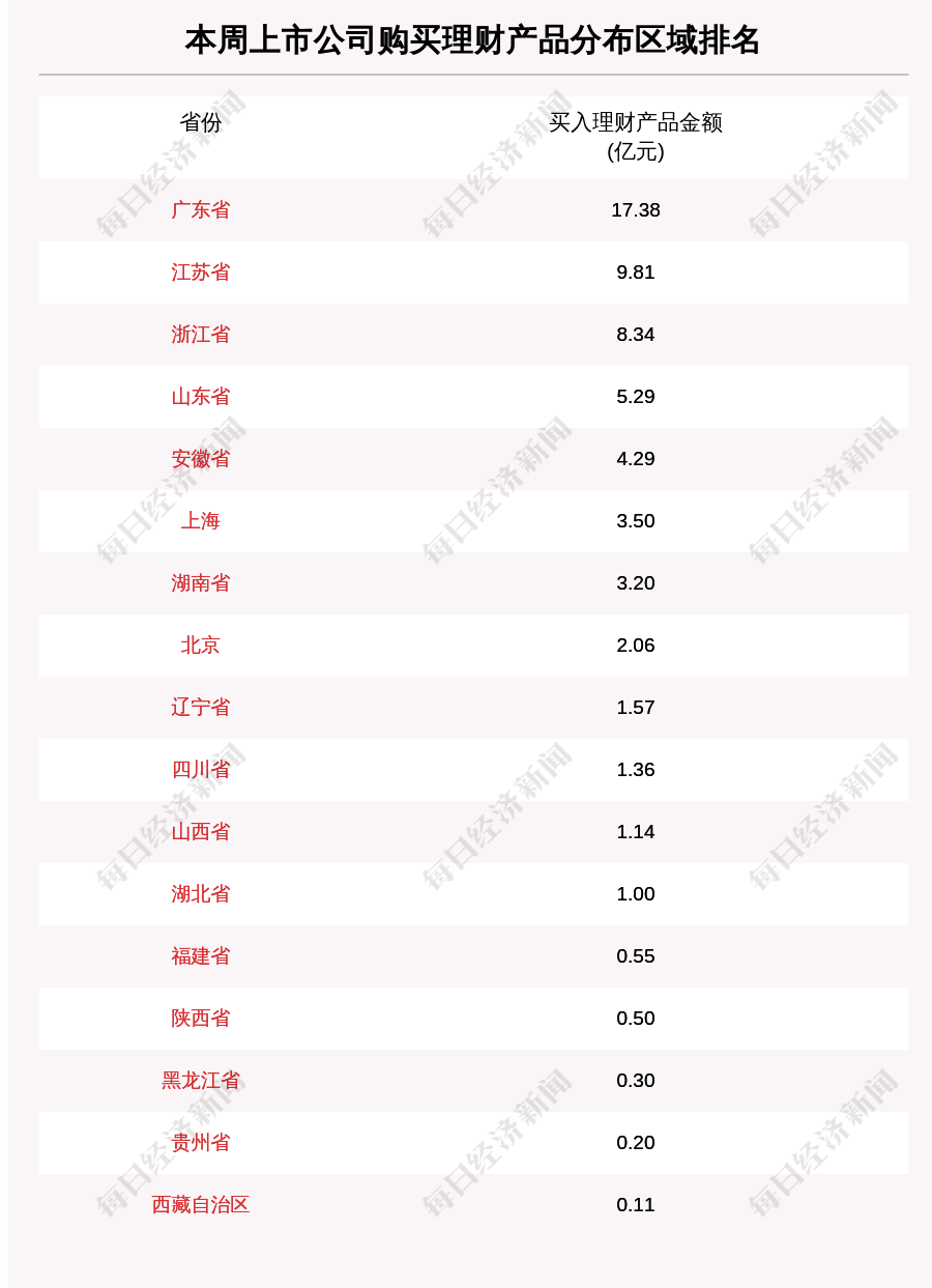 从上市公司所属地区上来看,本周买入理财产品金额排名前三的地区分别是广东省、江苏省、浙江省。