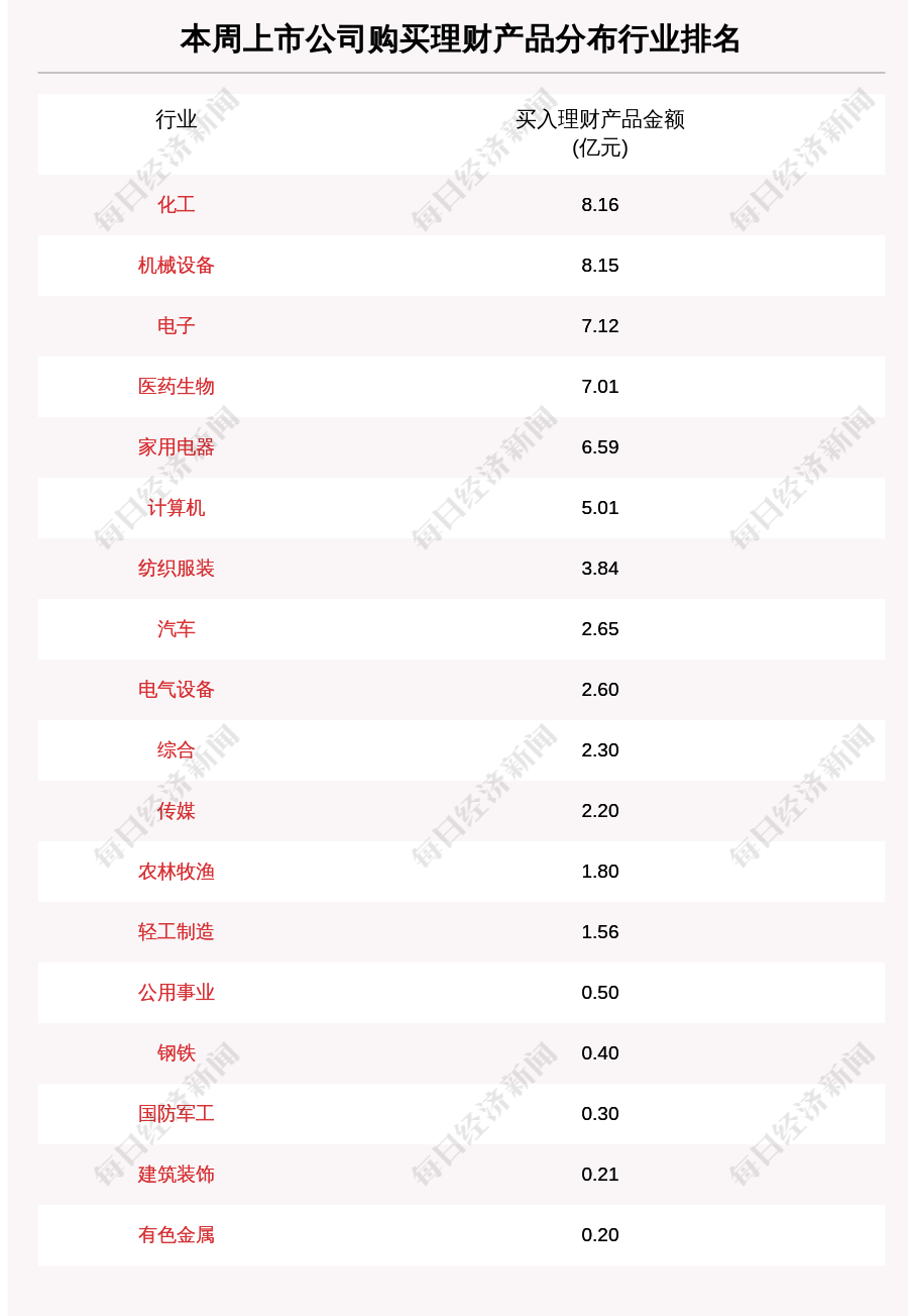 从上市公司所属行业上来看,本周买入理财产品金额排名前三的行业分别是化工、机械设备、电子。