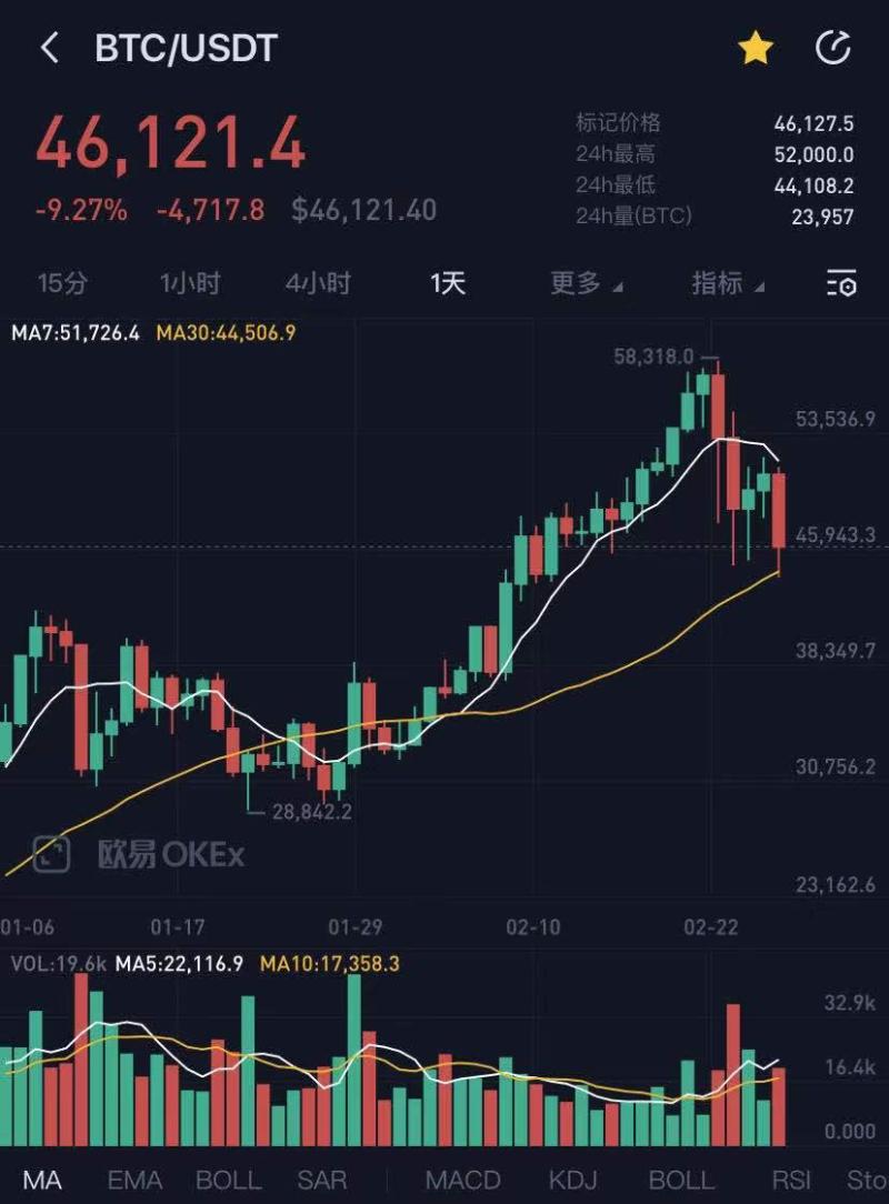 在50000美元盘桓3天之后,2月26日,比特币再遭重挫,一度狂泻超7000美元。