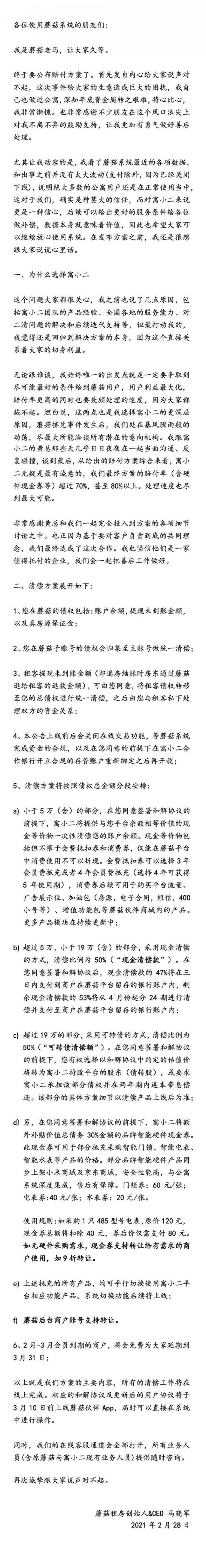 2月28日晚,蘑菇租房创始人、CEO马晓军发出第三封公开信,这封信主要内容为清偿方案。方案将商户在蘑菇的账户余额、提现未到账金额以及真房源保证金归结为债权;商户在蘑菇子账号的债权会归集至主账号做统一清偿。