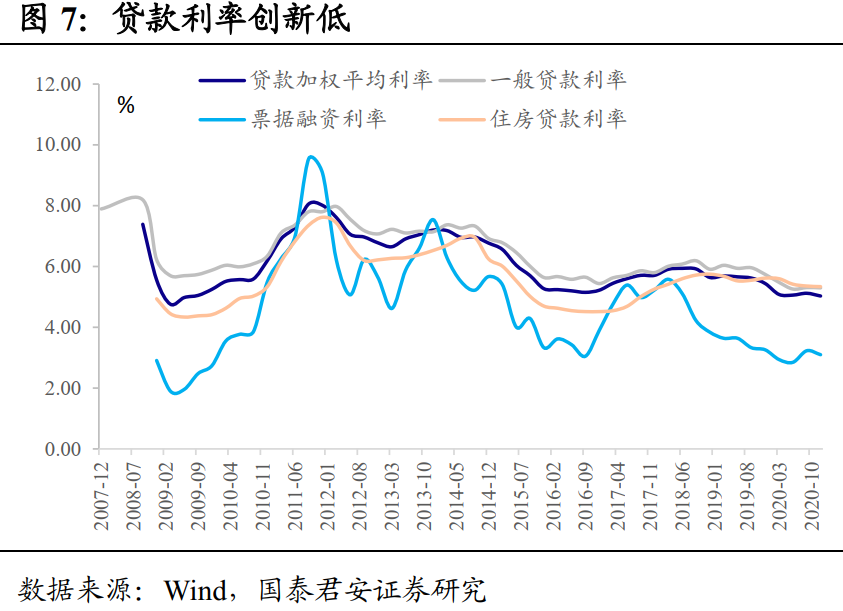 坏账率攀升也会导致信用的被动收紧。“紧信用”下一个影响的对象是信贷市场。2020Q4贷款加权利率、一般贷款利率、票据融资利率、个人住房贷款利率分别为5.03%、5.30%、3.10%、5.34%,分别环比下行9bp、1bp、13bp、2bp;其中,一般贷款利率已经创下了历史新低。