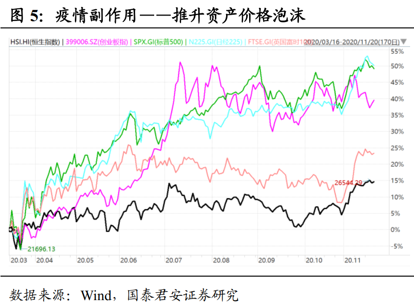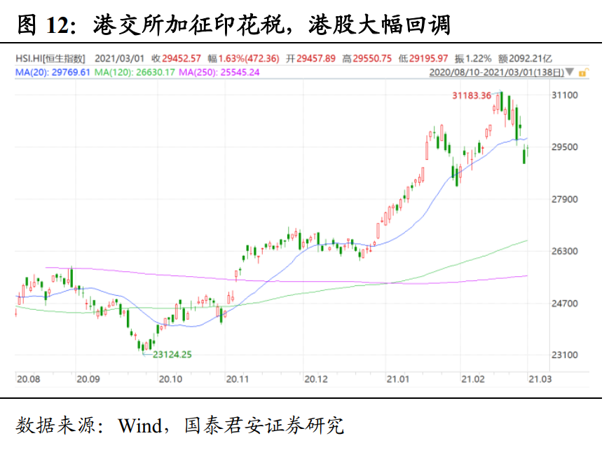 防范全球金融风险传导,也需要提前收紧货币政策做好应对。2021年金融风险更体现在全球资本市场不稳定性加大。一方面,累积了巨大涨幅后市场内在波动性加大,此前美股GME乱象就是很好例证。另一方面,通胀压力增大则必然会导致货币政策收紧,但配合财政赤字化又被动拉长宽松时间,除非美联储很好地实现了YCC,否则将会陷入两难境地。而美股的波动加大势必向全球传染,引发大级别的资本市场“地震”。当前,无论是我国货币政策的矜持表态,还是港交所超预期释放继续加征印花税言论,都是在提前应对潜在的传染风险。