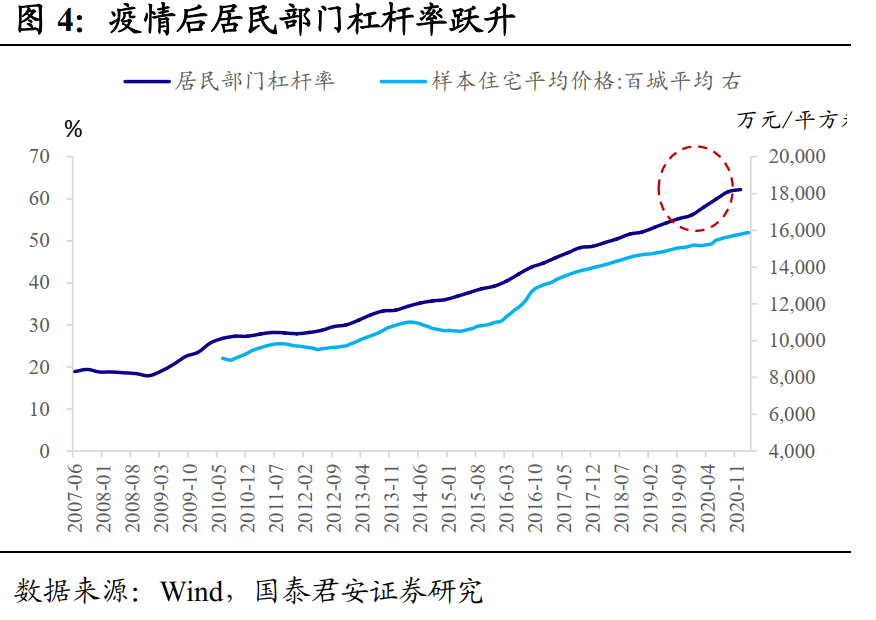 结合数据来看,“抗疫”中货币“大放水”带来的副作用已经体现在宏观杠杆率上。全球三大经济体,中国、美国、日本政府部门杠杆率分别较疫情前环比上升7.7%、19.6%、21.4%。由于隐性债务的存在,我国政府杠杆率实际上还被大幅低估。2020年四个季度,我国居民部门杠杆率分别环比上升1.9%、1.9%、1.8%、0.5%,季度平均环比涨幅比2019年的1.0%高出0.5个百分点。
