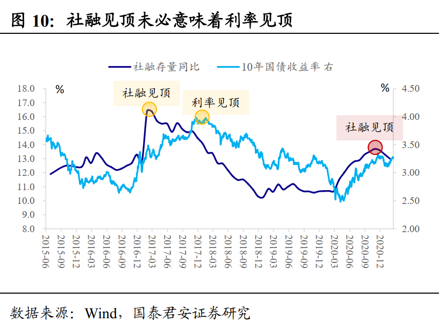 2017年是国内债市投资者首次经历因金融严监管导致的大熊市。从基本面角度,名义GDP增速于2017Q1见顶,但利率出现拐点却是2018年初,货币政策的明确拐点则是在2018年4月17日的定向降准。2020年11月启动的宽松小周期,2021年春节前后未进行常规的降准或结构性的流动性安排,前者与社融创新高背离,而后者则与社融加速回落背离。