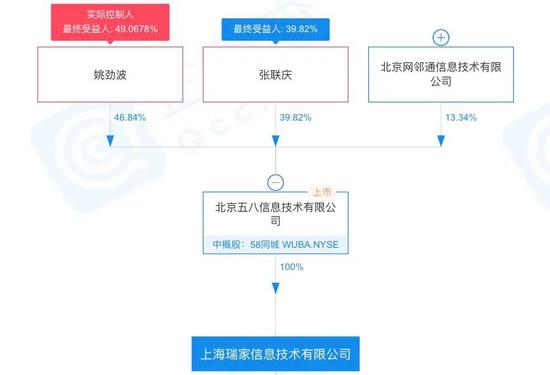 新入股的大股东“上海瑞家”成立于2007年1月,法人为庄建东,注册资本2.011亿元,由北京五八信息技术有限公司100%持股,最受受益人为姚劲波,持股49.0678%。