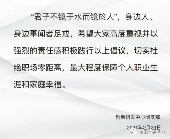 在这份《倡议书》的最后,创新研发中心团支部还做出如下总结:“‘君子不镜于水而镜於人’,身边人、身边事闻者足戒,希望大家高度重视并以强烈的责任感积极践行以上倡议,切实杜绝职场零距离,最大程度保障个人职业生涯和家庭幸福。”
