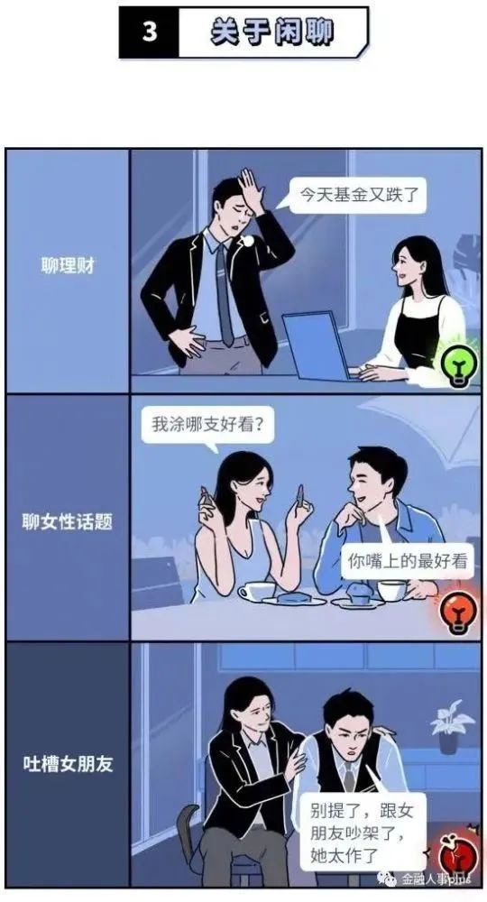 在同事间的闲聊中,漫画倡议聊理财避免谈论女性话题甚至吐槽自己的“另一半”;
